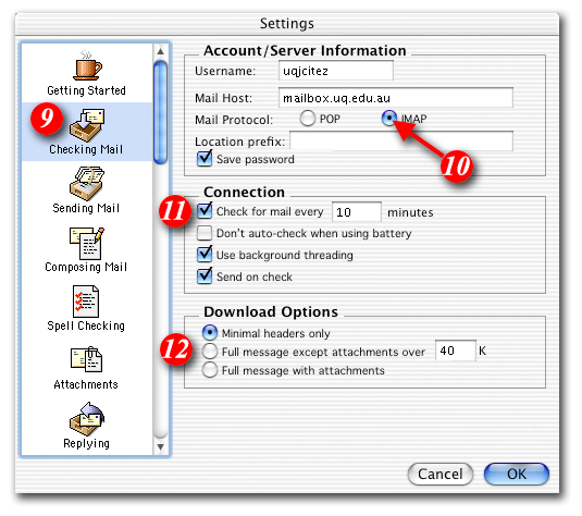 | 11)Tick the 'Check for mail every _ minutes ' checkbox and set it to at least 10 minutes |