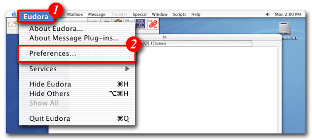 | 1)Open Eudora and click 'Eudora' in the menu bar |