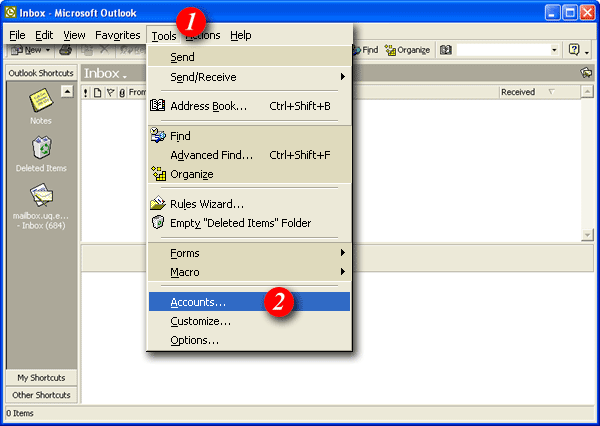 | 2)Select 'Accounts'. (Note: If you see 'Services' instead of accounts Outlook 2000 is running in corporate mode. You cannot setup IMAP in this mode and will need to refer to the Outlook 2000 POP3 Corporate Guide). | |||||