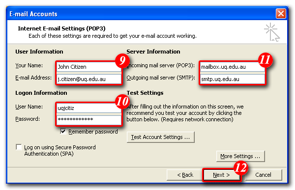 | 9)Enter your name and email address (Note: the name you enter here will be displayed on all outgoing email messages) |